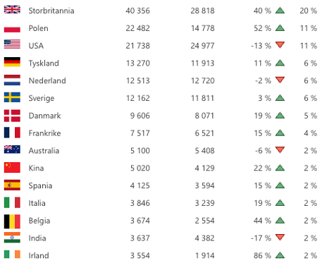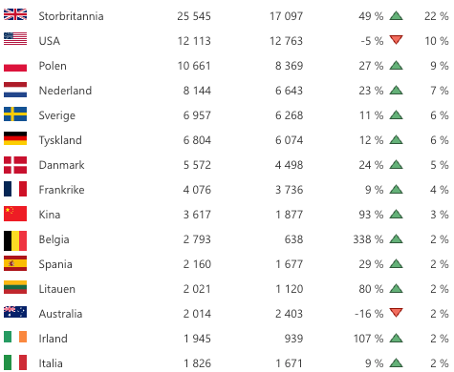 Det er også verdt å merke seg at Kina har stor prosentvis økning med 93 % sammenlignet med fjorårets februar.